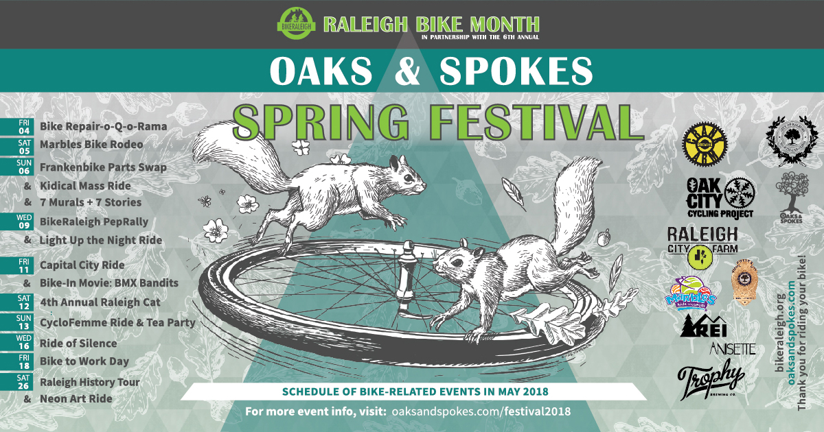 What does that mean? It means you have an array of bike-related activities all throughout the month to help inspire you to adventure the city of Raleigh by bike. Oaks & Spokes has been working hard with our volunteers and local partnerships to provide a truly outstanding lineup of events.