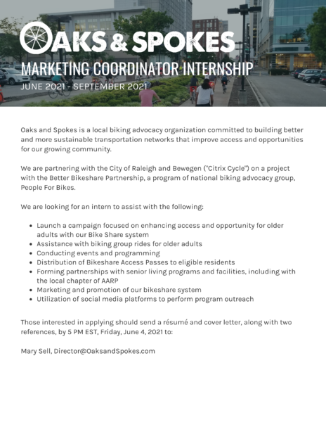 Applicants are encouraged to submit materials by June 4, 2021. For more information, contact Mary Sell at Director@OaksandSpokes.com.